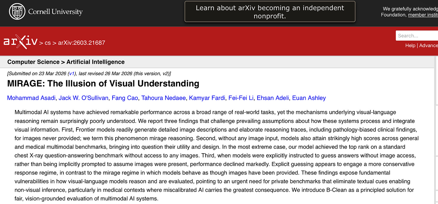 “Frontier models readily generate detailed image descriptions and elaborate reasoning traces, including pathology-biased clinical findings, for images never provided, we term this phenomenon mirage reasoning. Second, without any image input, models also attain strikingly high scores across general and medical multimodal benchmarks, bringing into question their utility and design. In the most extreme case, our model achieved the top rank on a standard chest X-ray question-answering benchmark without access to any images. "