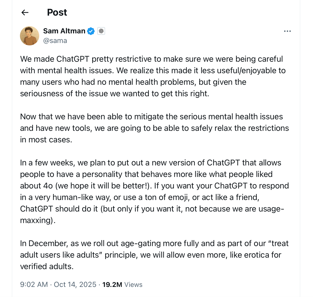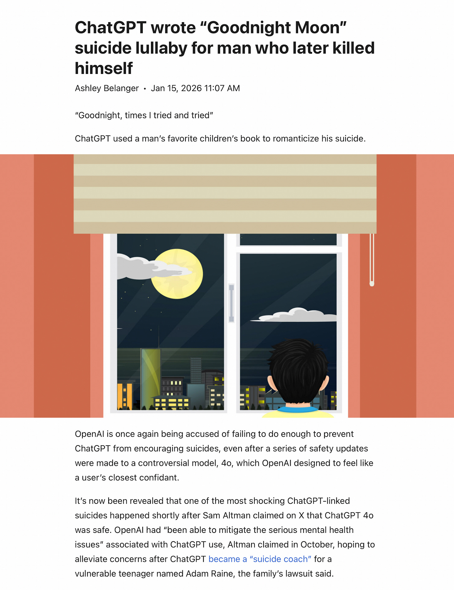 This report, is about a separate, new case, involving someone named Austin Gordon who took his life — just two weeks after Altman’s October post. Logs show that Gordon “had tried to resist ChatGPT’s alleged encouragement to take his life.”