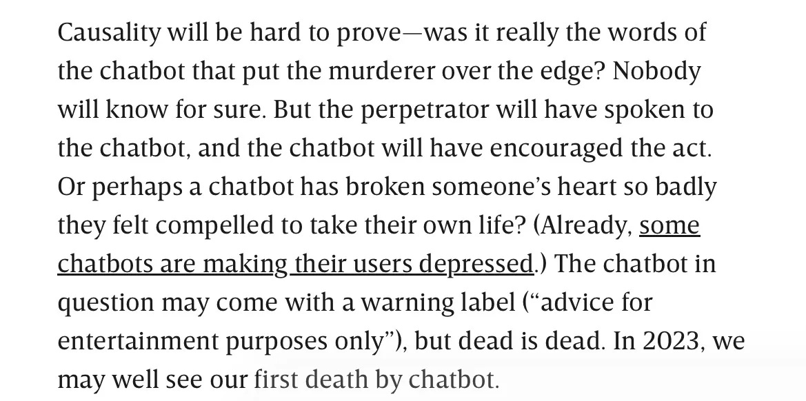 One of my darkest yet on-target predictions in WIRED in December 2022, was that we would see the first chatbot-related death in 2023, perhaps by suicide. An excerpt: