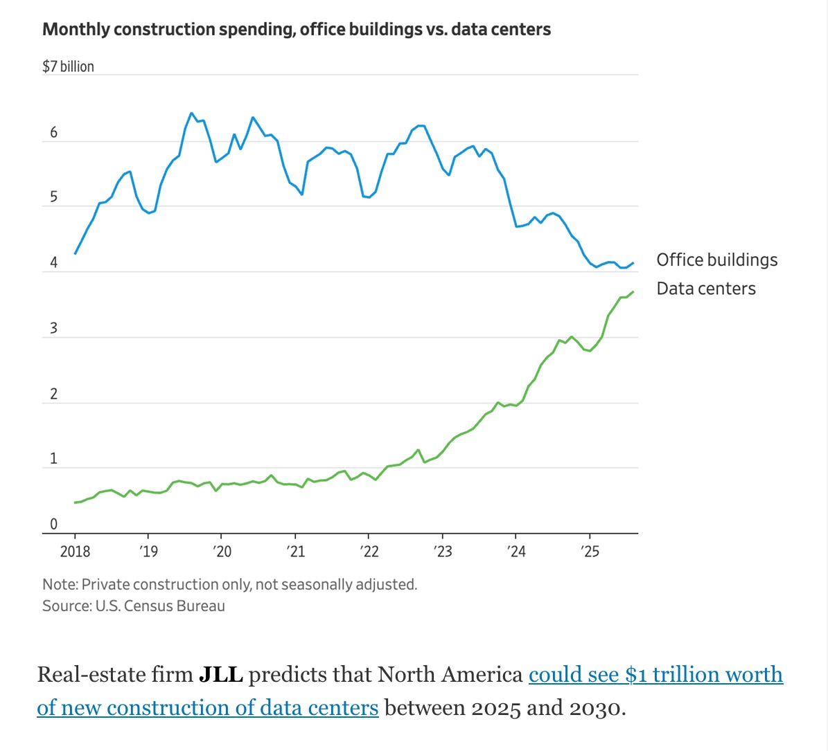 Silicon Valley and The White House appear to be completely smitten with large language models, rebuilding the world around the hope that LLMs will lead to artificial general intelligence, and a radically redefined economy. Signs of this enthusiasm are widespread. The generative AI economy has driven Nvidia and the valuations of private companies like OpenAI to astonishing heights. According to the Wall Street Journal, “Business investment in AI might have accounted for as much as half of the growth in gross domestic product, adjusted for inflation, in the first six months of the year.” And it’s not just chips; data centers are a big part of what’s going on too, per this graph in Tom Loftus’s WSJ newsletter this morning shows that construction spending on data centers is going way way up, even as construction for office buildings is declining: