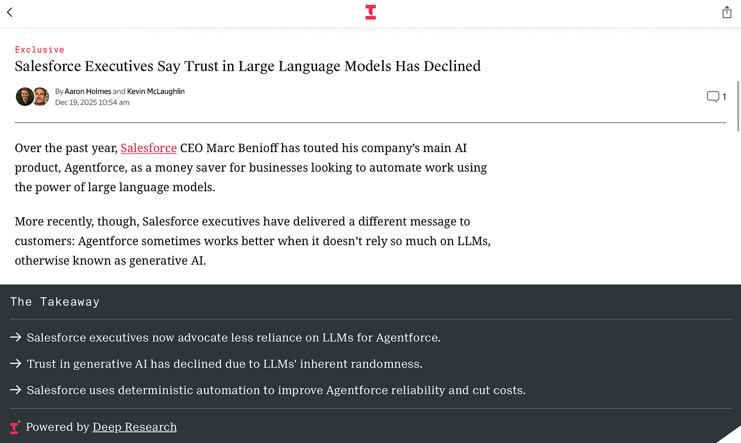 Meanwhile, in an echo of The Klarna Effect, Salesforce is backing down on its own enthusiasm for LLMs, warning that they aren’t trustworthy. The Information quotes an exec there as saying that trust in generative AI (you know, the kind that you need all those data centers for) has declined over the last year: