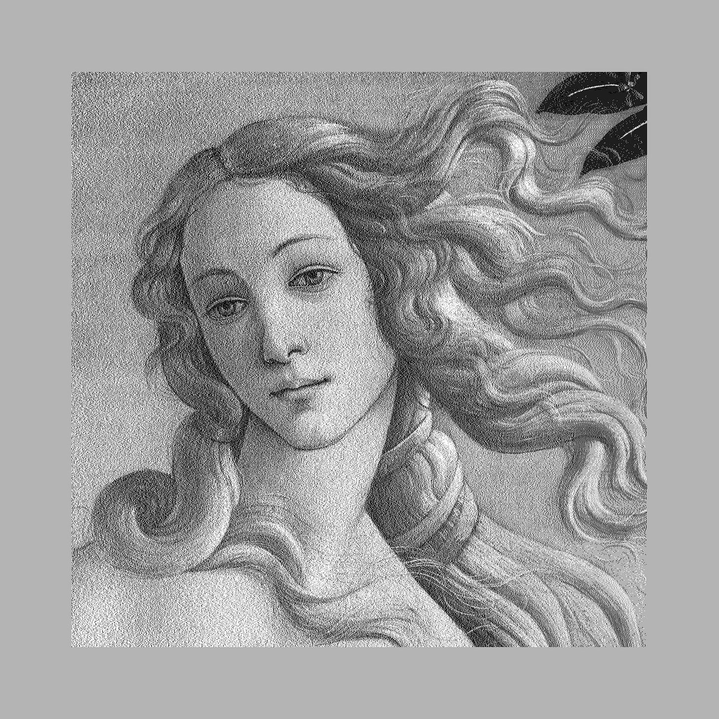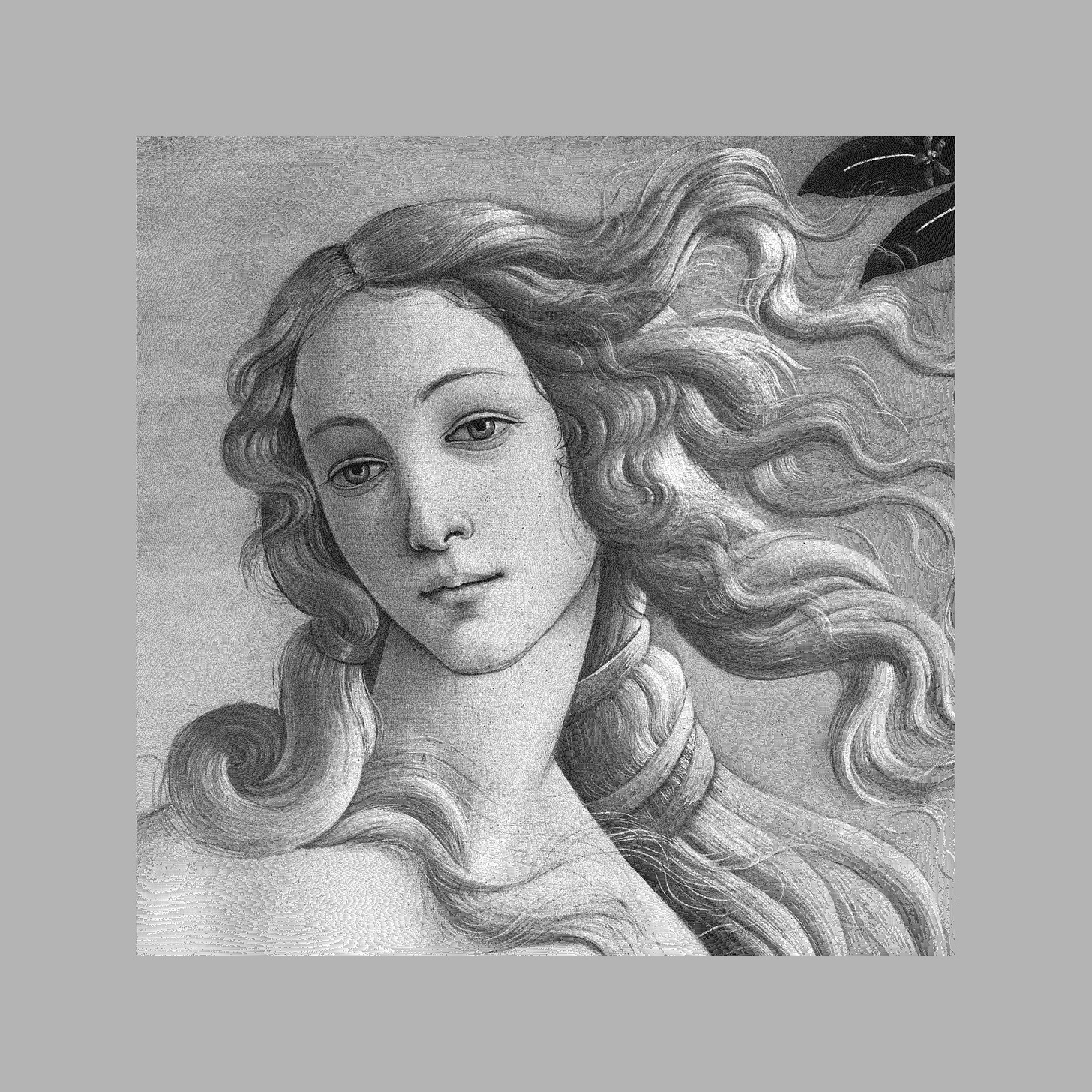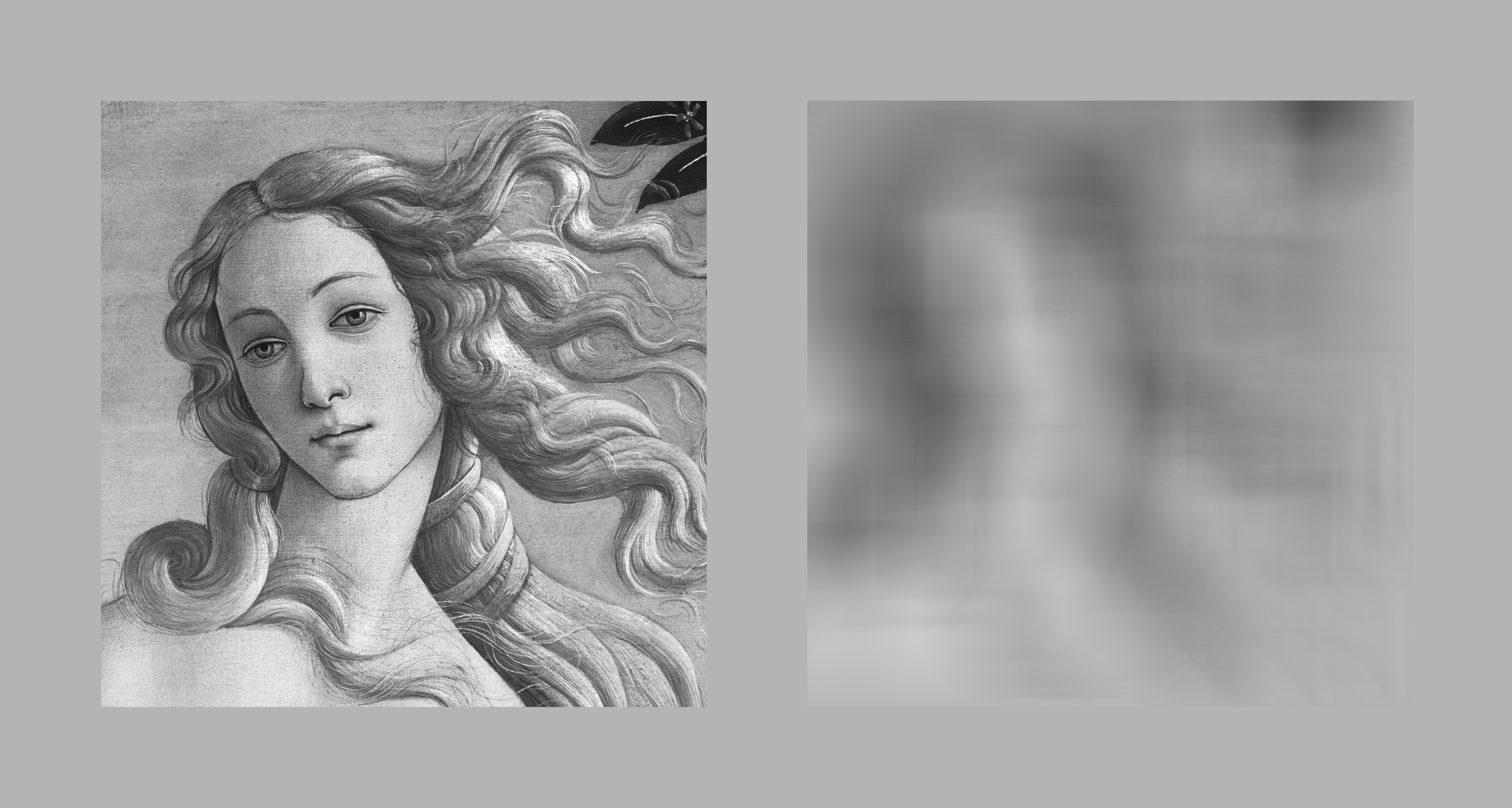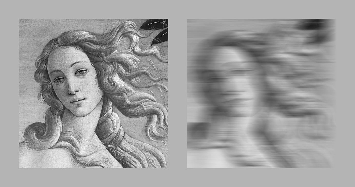 In the illustration below, the left panel shows a detail of The Birth of Venus by Sandro Botticelli; the right panel is the same image ran through the right-aligned moving average blur algorithm with a 151-pixel averaging window that moves only in the x direction: