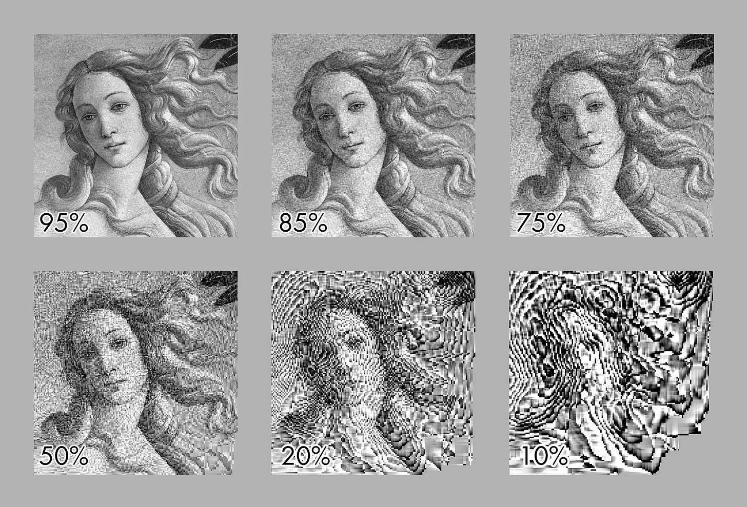 Remarkably, the information “hidden” in the blurred image survives being saved in a lossy image format. The top row shows images reconstituted from an intermediate image saved as a JPEG at 95%, 85%, and 75% quality settings: