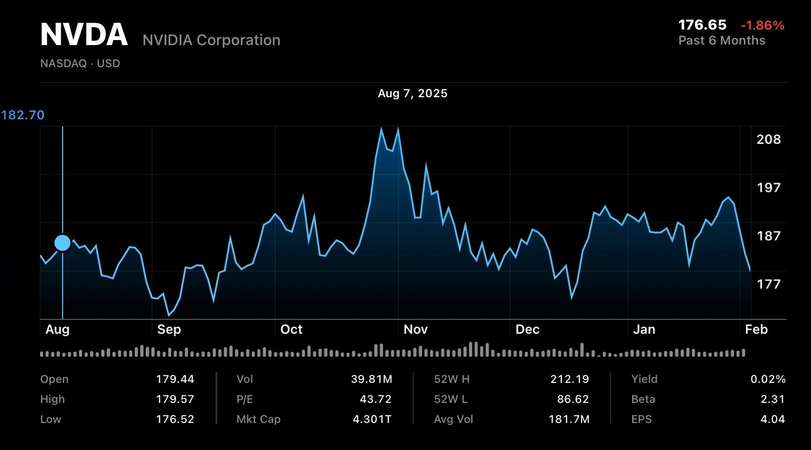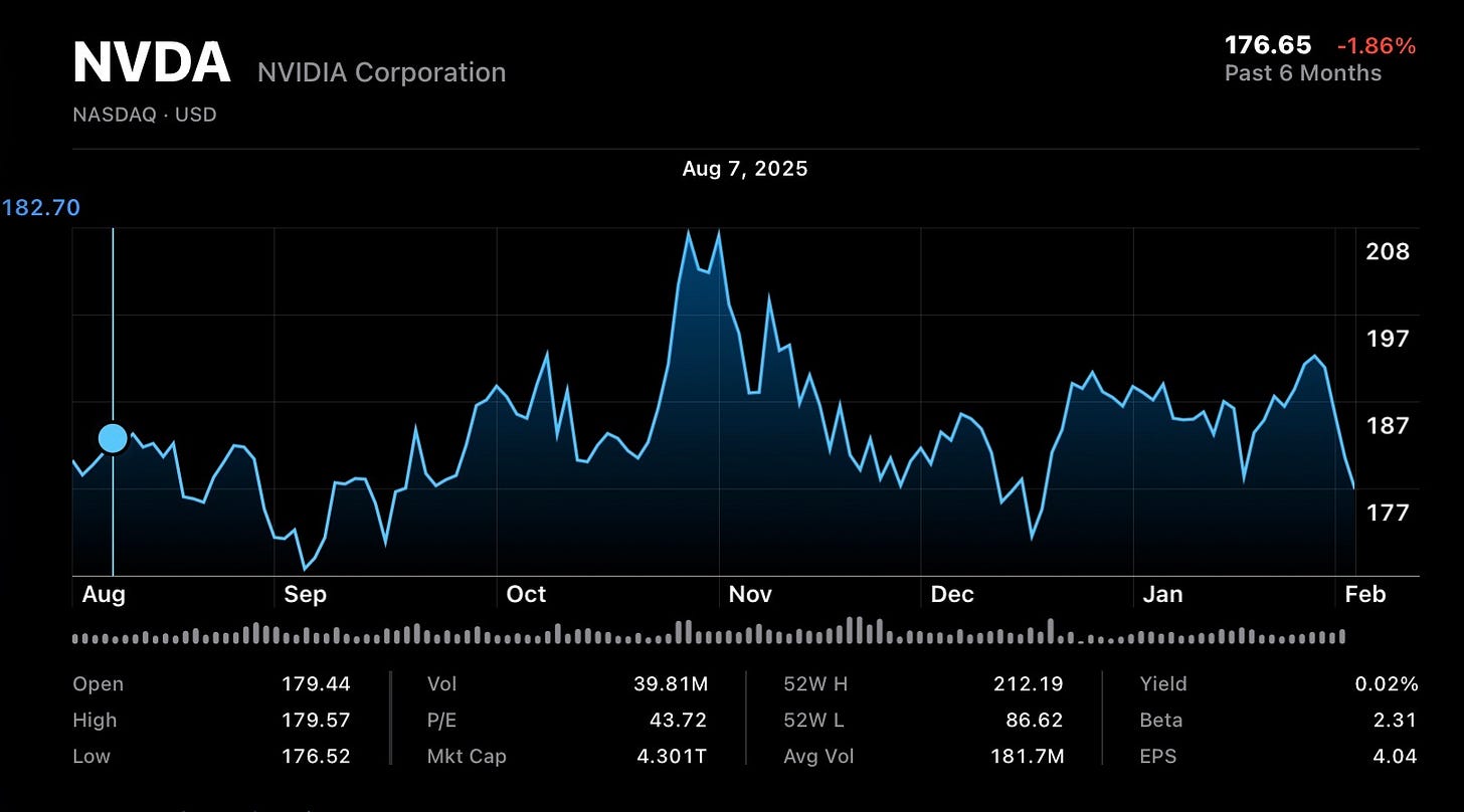 There is the NVidia of the last five years (up 1200%), and the Nvidia of the last six months (down 2%). When ChatGPT launched, it was trading at 14; it’s gone up by more than a factor of ten since then, rising, until recently like a rocket.
